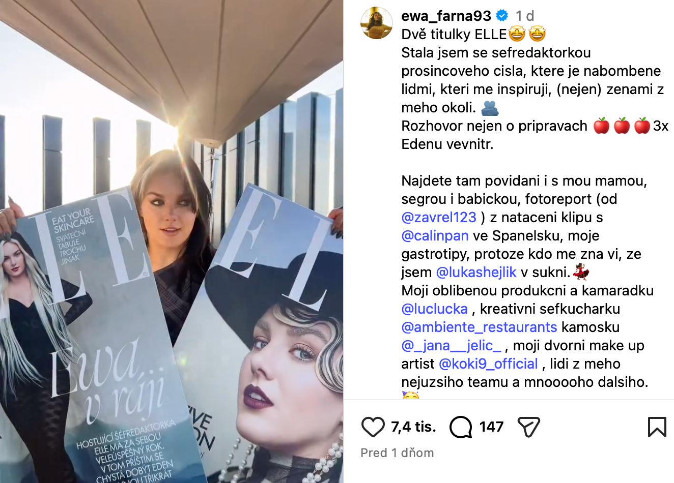 Aj keď má Ewa Farna státisíce sledovateľov na sociálnych sieťach, ponuka, aby skúsila osloviť aj čitateľov českého vydania časopisu Elle, bola pre ňu výzvou, no nezaváhala. "Dostala som možnosť stať sa šéfredaktorkou pre decembrové číslo," napísala v úvodníku časopisu. K výberu obsahu vysvetlila: "Túto ELLE sme nabúchali predovšetkým ženami z môjho okolia, ľuďmi, ktoré ma inšpirujú. Mám totiž odjakživa pravidlo - obklopovať sa lepšími, než som ja. Sama sa potom učím, vzhliadam k nim a presne to ma potom posúva dopredu a rozvíja."