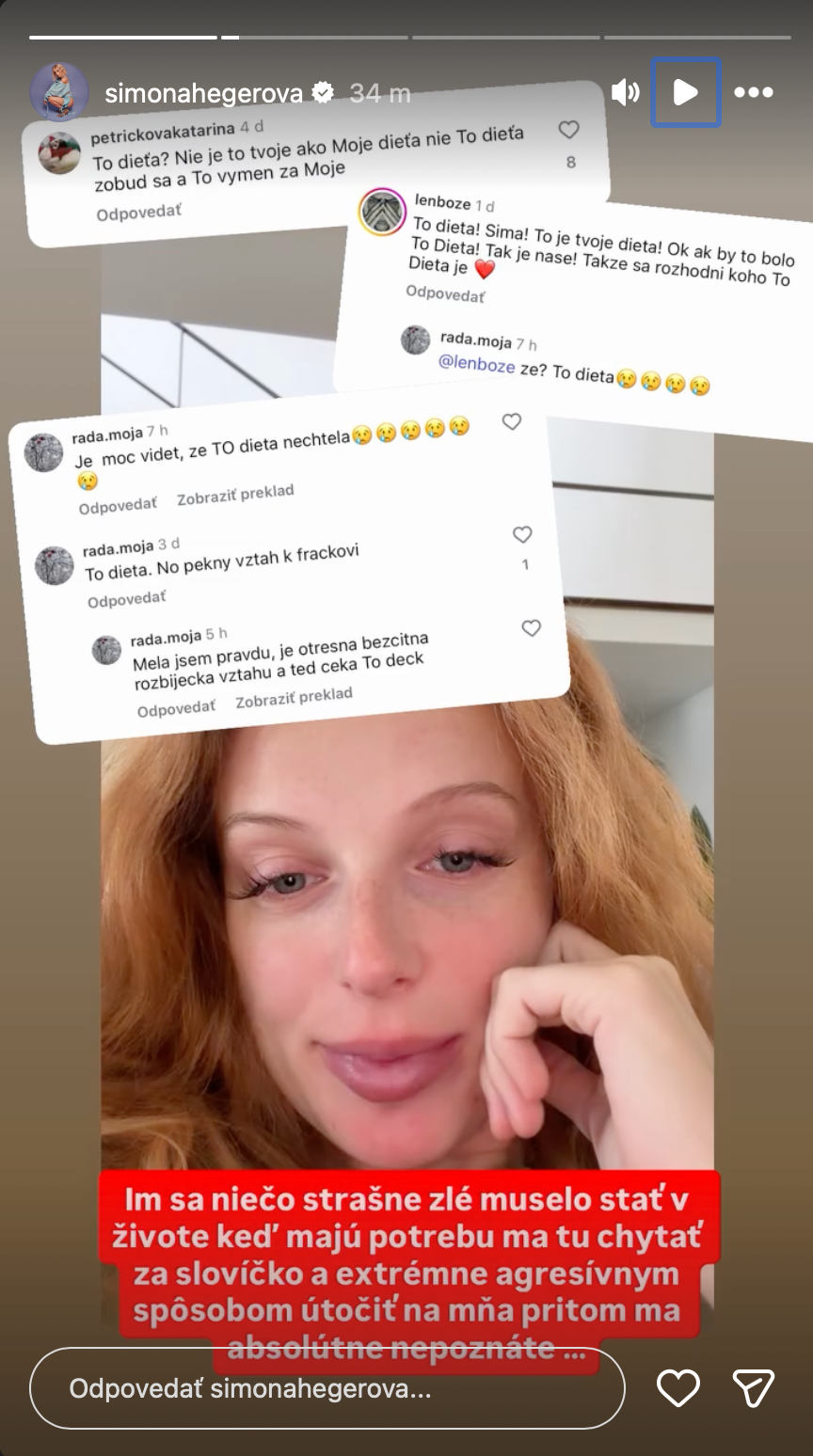 „To dieťa? Nie je to dieťa, zobuď sa a to vymeň za moje,“ odkázala speváčke jedna z komentujúcich. Ďalšie reakcie boli ešte ostrejšie a miestami až šokujúce. „Je veľmi vidieť, že to dieťa nechcela,“ napísala ďalšia žena a pridala aj uštipačnú poznámku: „To dieťa. No pekný vzťah k frackovi.“ Objavili sa aj vyslovene extrémne útoky: „Mala som pravdu, je otrasná, bezcitná rozbíjačka vzťahu a teraz čaká to decko.“ Hoci sa našli aj fanúšikovia, ktorí sa Simy zastali, vlna negativity bola zarážajúca. "Je neuveriteľné, koľko nepríjemných ľudí tu komentuje... Čo je s vami? Ste žiarliví? Nemôžete založiť rodinu? Nepáči sa vám to?" napísala na obranu Sima jedna z komentujúcich a dodala, aby sa každý staral sám o seba.