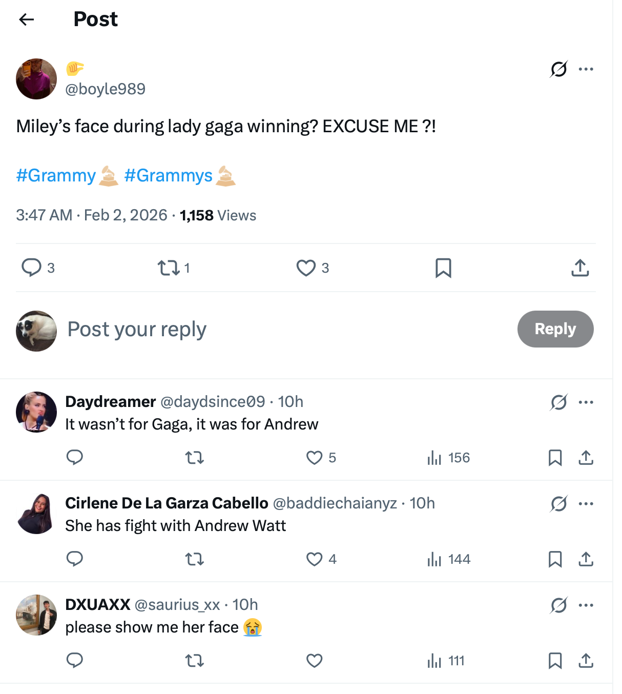 Fanúšikovia si tento moment všimli okamžite a sociálne siete zaplavili vášnivé reakcie. „Mileyina tvár počas víťazstva Lady Gaga? PREPÁČTE?!“ písali šokovaní diváci, zatiaľ čo ďalší sa pýtali: „Teraz potrebujem vysvetlenie, prečo Miley nevstala...“ Fakt, že Miley Cyrus ostala chladne sedieť, rozpútal lavínu špekulácií. Je za tým žávisť, starý konflikt alebo niečo oveľa pikantnejšie? – pýtali sa fanúšikovia naprieč sociálnymi sieťami.