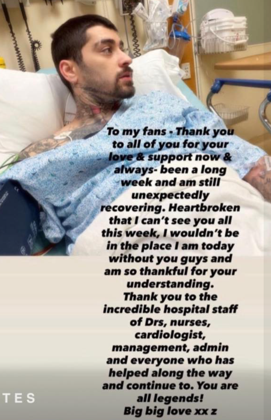 Sám Zayn situáciu opísal veľmi otvorene. "Bol to dlhý týždeň a stále sa z toho zotavujem," napísal fanúšikom, čím potvrdil, že problémy trvajú už niekoľko dní. Zároveň priznal aj sklamanie z toho, že musí rušiť plány: "Je mi veľmi ľúto, že vás tento týždeň nemôžem vidieť." Spevák pritom nešpecifikoval, čo presne ho do nemocnice dostalo. Isté však je, že kvôli zdravotnému stavu zrušil viacero vystúpení a stretnutí s fanúšikmi. Tie sa mali konať v USA aj vo Veľkej Británii, no momentálne nie je jasné, kedy ich nahradí.
