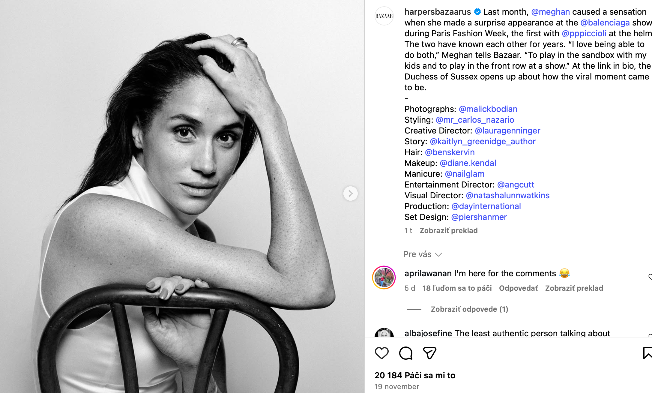 Z obálky decembrového čísla magazínu Harper’s Bazaar pozerá Meghan Markle, ktorá získala vďaka manželstvu s princom Harrym titul vojvodkyňa zo Sussexu a používa ho vytrvalo aj v USA, kde spolu s ich dvomi deťmi žijú od roku 2020. Na jej tvári nemá veľa mejkapi, oblečená je v elegantnom tmavošedom kostýme a treba uznať, že jej to sekne. Súčasťou vydania je aj rozsiahly rozhovor doplnený jej fotkami v rôznych outfitoch v jednoduchom štýle. Práve ten ju vyjadruje najviac, no dobre zapadá aj do jej podnikateľských aktivít s vlastnou lifestylovou značkou As Ever. Okolo toho, spomienok, jej názorov, ako aj vzťahov sa točil aj rozhovor.