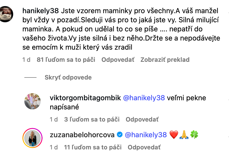 Na šíriace sa reči o kríze v manželstve Zuzany Belohorcovej (39) a Vlastimila Hájka (51) doposiaľ obaja svojou odpoveďou nič jasné nepovedali. No podľa najnovších reakcií Zuzany na komentáre k fotke s deťmi sa už zdá byť jasné, že sa ich životy rozdelili.