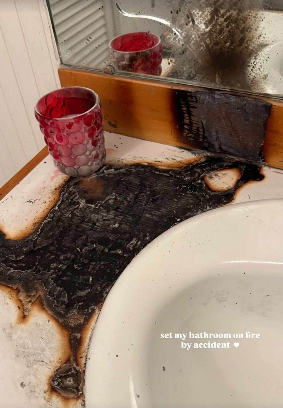 Medzi fotografie z udalostí uplynulého roka zaradila speváčka Sabrina Carpenter na Instagram aj jednu, ktorá vyzerala hrozivo. Vidieť na nej tmavé fľaky spáleného priestoru medzi umývadlom, stenou a zrkadlom, na ktorom sú zjavné stopy od plameňov. "Náhodou som si podpálila kúpeľňu," poznamenala k ohňom poškodenej časti kúpeľne na fotke, ktorý sa zrejme vznietil po prevrhnutí zapálenej sviečky. Z romantickej atmosféry sa razom stal námet na horor. O detailoch ani dátume tejto udalosti sa ale Sabrina nezmienila, dobrá správa je, že zrejme hroziaci požiar rýchlo uhasili.