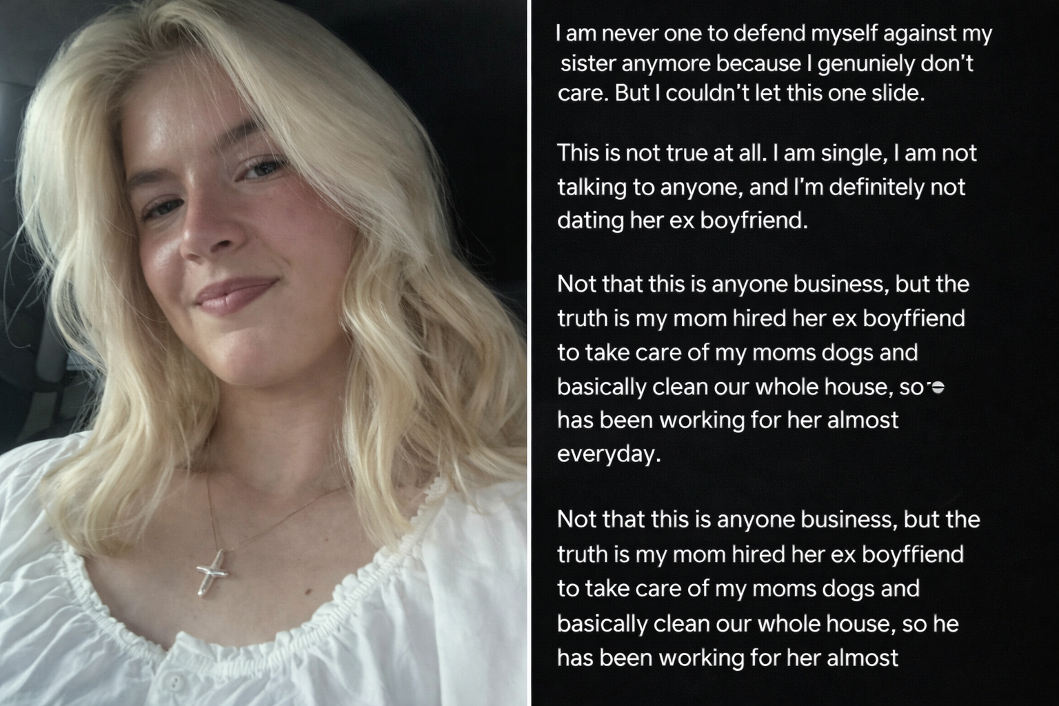 Celý rozruch odštartovalo video, ktoré Sami zverejnila na sociálnej sieti, v ktorom naznačila, že jej vlastná sestra mala prekročiť hranice dôvery a začať si s jej bývalým priateľom. K údajnej dvojnásobnej nevere malo podľa jej slov dôjsť ešte počas trvania ich vzťahu. Fanúšikovia okamžite začali pátrať po detailoch a špekulovať, o koho by mohlo ísť. Sami meno ex-priateľa priamo neuviedla, no diskusie na sociálnych sieťach nabrali na intenzite o to viac. Situácia o to viac zaujala verejnosť, že vzťahy medzi sestrami boli napäté už v minulosti.