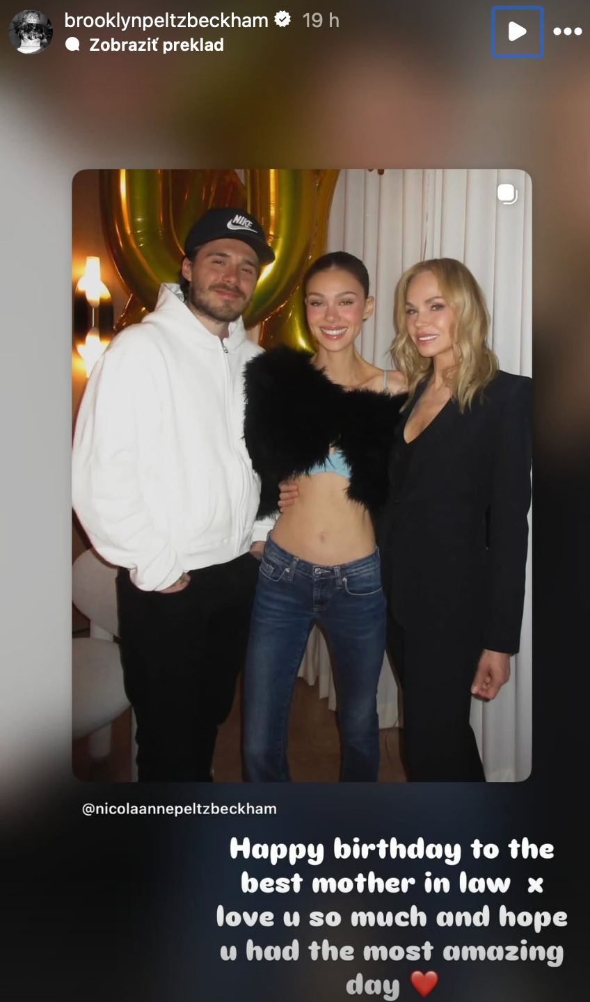 Brooklyn na Instagrame zverejnil fotografiu so svojou manželkou Nicolou Peltz a jej mamou Claudiou Heffner Peltz. K záberu pridal odkaz: "Všetko najlepšie k narodeninám tej najlepšej svokre. Veľmi ťa ľúbim a dúfam, že si mala úžasný deň." Azda by to aj bolo milé vyznanie od zaťa, ak by príspevok nezverejnil práve v britský Deň matiek – a pritom ani slovom nespomenul vlastnú mamu Victoriu.