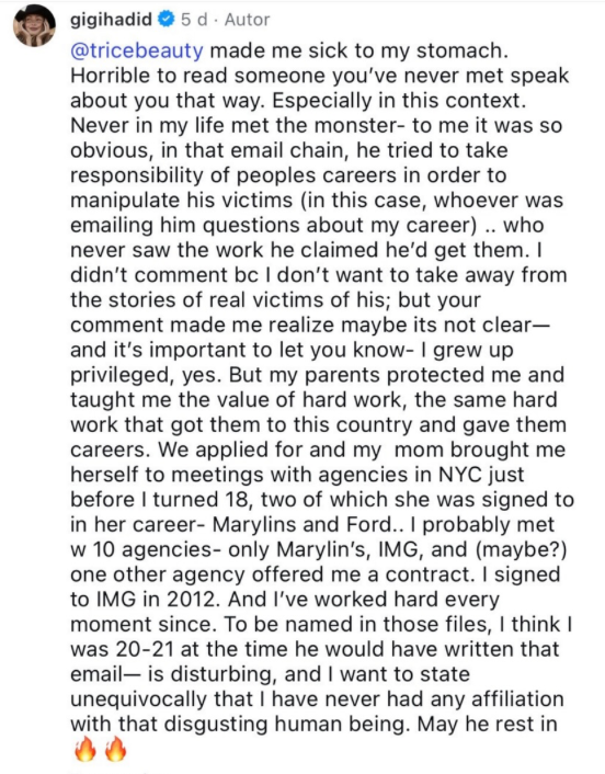 Z príspevku Gigi Hadid v komentároch na Instagrame bolo zjavné, že ju spojenie s odsúdeným sexuálnym predátorom Jeffrey Epstein, ktorý má na svedomí mnohé nevinné obete, poriadne zasiahlo. „Bolo mi z toho zle od žalúdka. Je hrozné čítať, ako o vás hovorí niekto, koho ste nikdy nestretli – najmä v tomto kontexte,“ napísala bez servítky. Zároveň rázne dodala: „Nikdy v živote som nestretla to monštrum.“ Podľa nej je pritom z e-mailov zrejmé, že sa len snažil hrať na niekoho, kým nebol. „Snažil sa prisvojiť si zásluhy za kariéry ľudí, aby manipuloval svoje obete,“ vysvetlila.