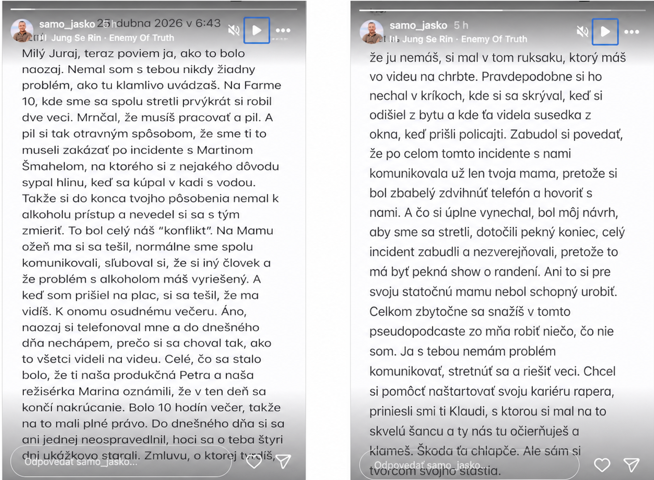 Zatiaľ čo sa Juraj snaží vinu hodiť na iných, režisér pripomenul jeho reakciu po incidente a zdôraznil, že televízia mu pôvodne chcela pomôcť. ,,Zabudol si povedať, že po celom tomto incidente s nami komunikovala už len tvoja mama, pretože si bol zbabelý zdvihnúť telefón. Celkom zbytočne sa snažíš v tomto pseudopodcaste zo mňa robiť niečo, čo nie som. Chcel si pomôcť naštartovať kariéru rapera, priniesli sme ti Klaudiu, s ktorou si mal na to skvelú šancu a ty nás tu očierňuješ a klameš. Škoda ťa chlapče," uzavrel režisér. Zdá sa, že táto televízna vojna slov tak skoro neskončí a diváci si po vypočutí oboch strán musia urobiť názor sami.