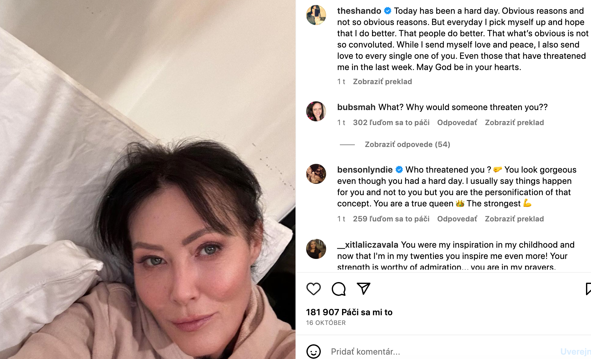 Popritom má Shannen doslova každý deň zvádza boj o život, ako sa zverila. "Dnešok bol náročný deň. Zo zrejmých, aj z nie tak zrejmých dôvodov. Ale každý deň sa zdvihnem a dúfam, že sa mi bude dariť lepšie. Že sa ľuďom darí lepšie. Že to, čo je zrejmé, nie je tak zložité," odkázala to, čo by malo byť jasné každému, kto má srdce na pravom mieste. No ak to nepochopia všetci, na tomto svete mier nikdy nebude. Aj keď, obvykle to nie sú bežní občania, ktorí vojnové peklo rozpútavajú...